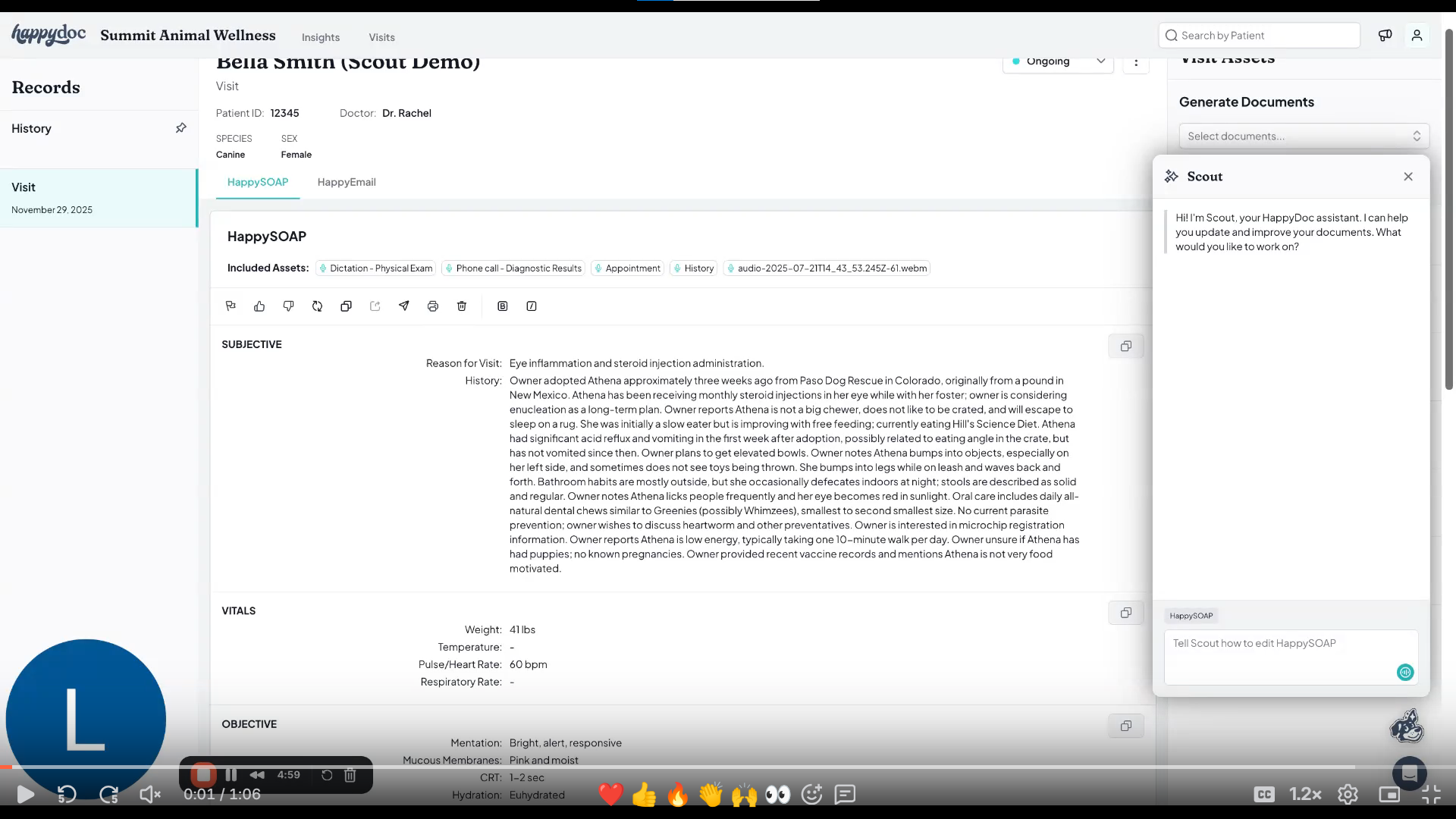 HappyDoc is an AI Assistant personalized for each veterinarian. It seamlessly integrates with your PIMS, providing valuable insights into the quality of care.Simply open the app on your phone, press start, and speak as you normally would. Like a human assistant, HappyDoc captures all the important details. When you’re done, hit stop, and within seconds, your record is complete and ready for export to your PIMS, with an option to edit before finalizing.